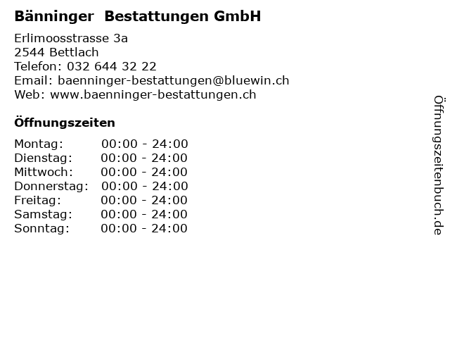 | Öffnungszeiten Bänninger Bestattungen GmbH in Bettlach anzeigen | |