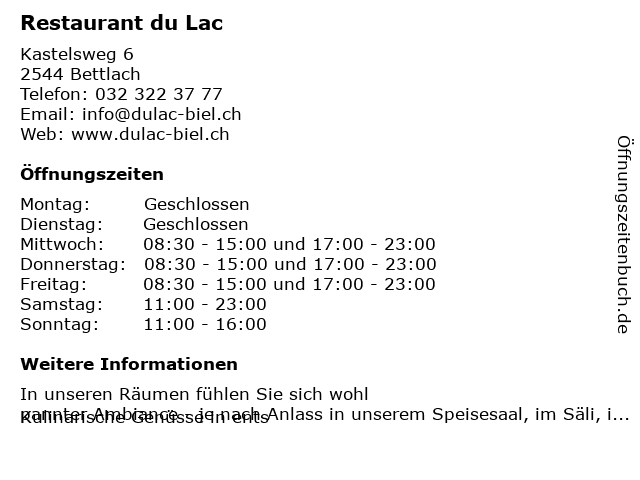 | Öffnungszeiten Restaurant du Lac in Bettlach anzeigen | |