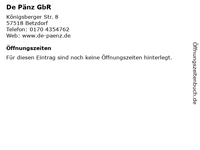 | Öffnungszeiten De Pänz GbR in Betzdorf anzeigen | |