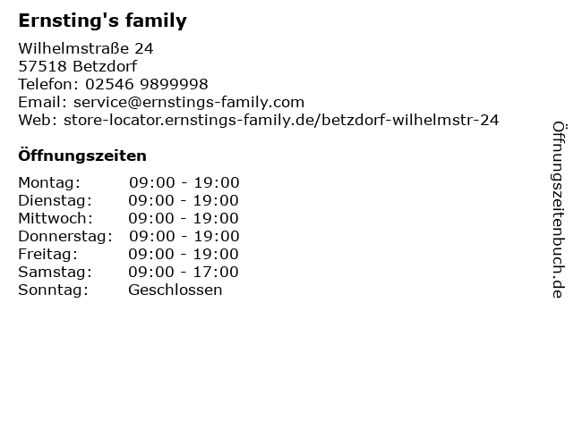 | Öffnungszeiten Ernsting's family in Betzdorf anzeigen | |