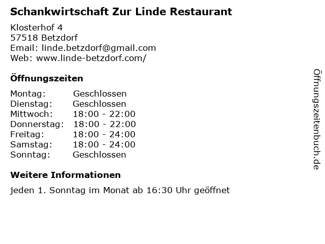 | Öffnungszeiten Schankwirtschaft Zur Linde Restaurant in Betzdorf anzeigen | |