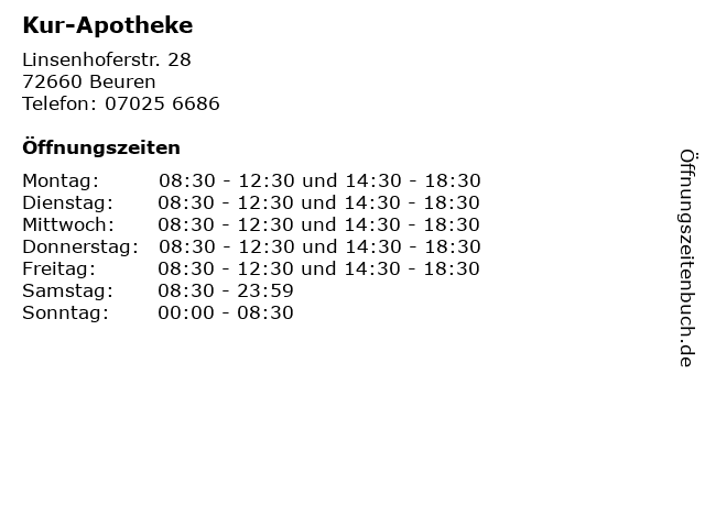 | Öffnungszeiten Kur-Apotheke in Beuren anzeigen | |