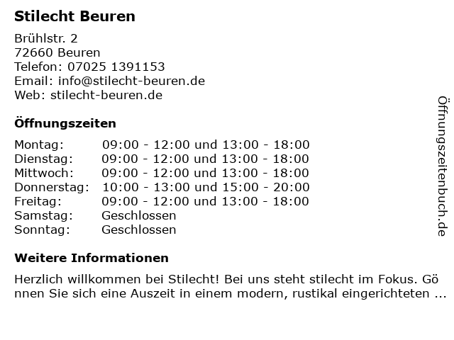 | Öffnungszeiten Stilecht Beuren in Beuren anzeigen | |
