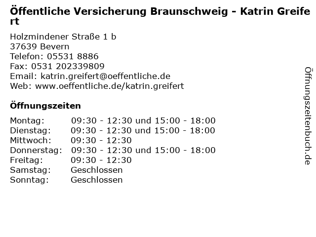 1 Öffentliche Versicherung Braunschweig - Katrin Greifert (Entfernung: 0,09 km) Forsterstr. 2, 37639 Bevern 2 Öffentliche Versicherung Braunschweig - Katrin Greifert (Entfernung: 0,12 km) Holzmindener Str. 2, 37639 Bevern 3 Öffentliche Versicherung Braunschweig - Michael Lockstedt (Entfernung: 4,19 km) Böntalstraße 12, 37603 Holzminden 6 Öffentliche Versicherung - Katrin Greifert (Entfernung: 6,03 km) Holenberger Straße 14, 37640 Golmbach |