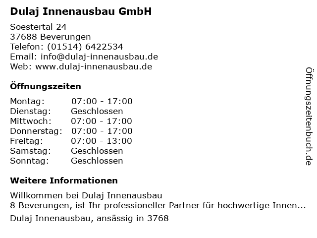 | Öffnungszeiten Dulaj Innenausbau GmbH in Beverungen anzeigen | |