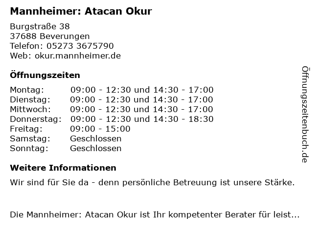 | Öffnungszeiten Mannheimer: Atacan Okur in Beverungen anzeigen | |