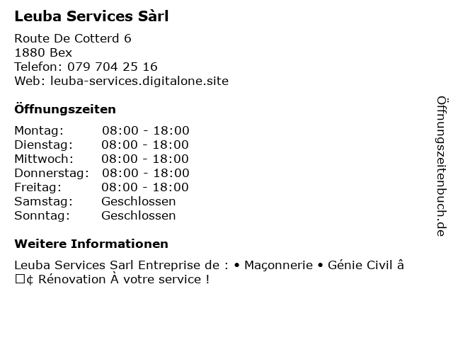 | Öffnungszeiten Leuba Services Sàrl in Bex anzeigen | |