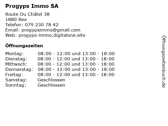 | Öffnungszeiten Progyps Immo SA in Bex anzeigen | |