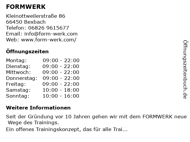 | Öffnungszeiten FORMWERK in Bexbach anzeigen | |