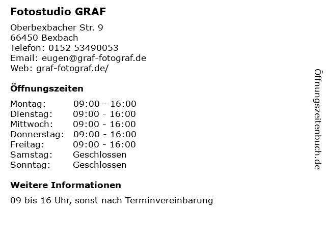 | Öffnungszeiten Fotostudio GRAF in Bexbach anzeigen | |