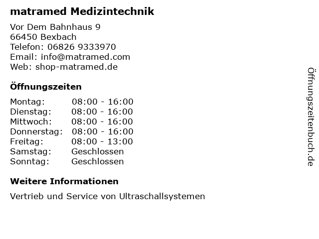 | Öffnungszeiten matramed Medizintechnik in Bexbach anzeigen | |