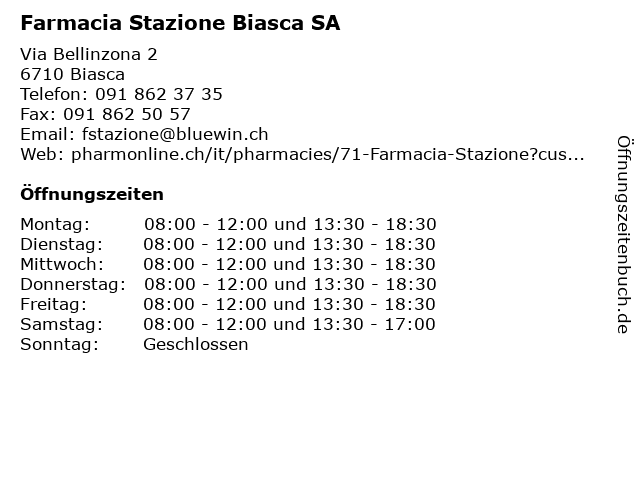 | Öffnungszeiten Farmacia Stazione Biasca SA in Biasca anzeigen | |