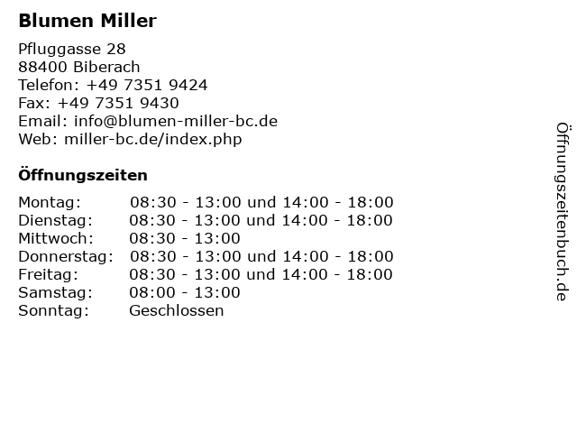 | Öffnungszeiten Blumen Miller in Biberach anzeigen | |