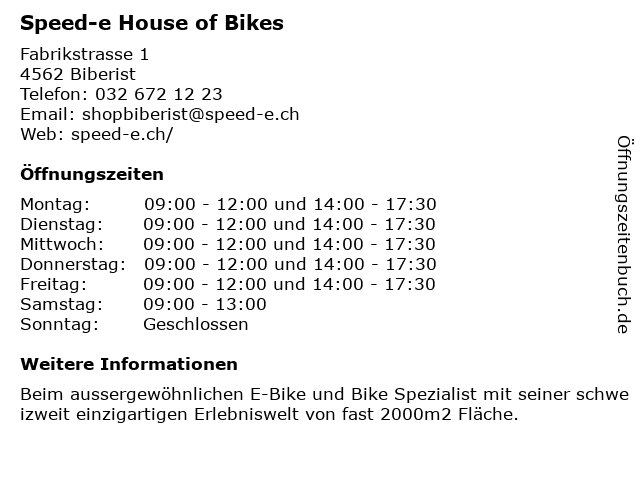 | Öffnungszeiten Speed-e House of Bikes in Biberist anzeigen | |