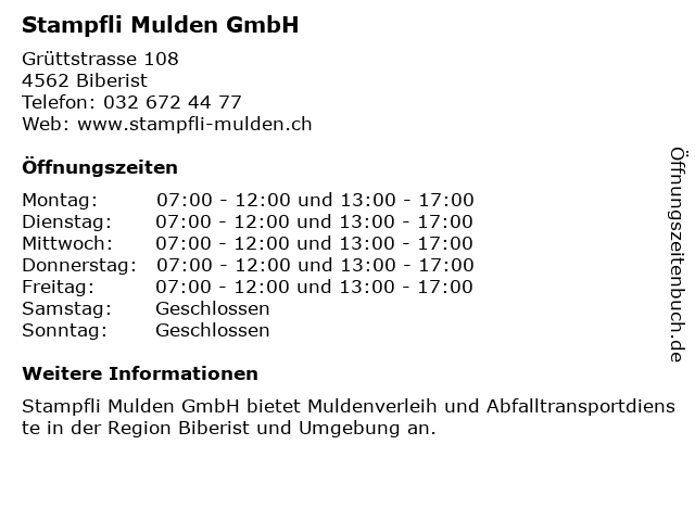 | Öffnungszeiten Stampfli Mulden GmbH in Biberist anzeigen | |