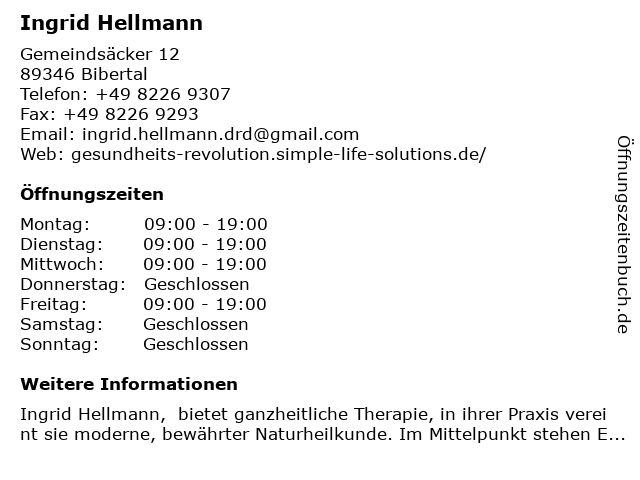 | Öffnungszeiten Ingrid Hellmann in Bibertal anzeigen | |