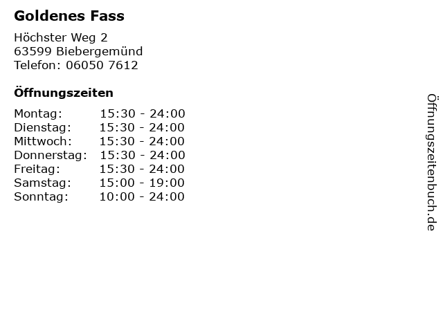 | Öffnungszeiten Goldenes Fass in Biebergemünd anzeigen | |