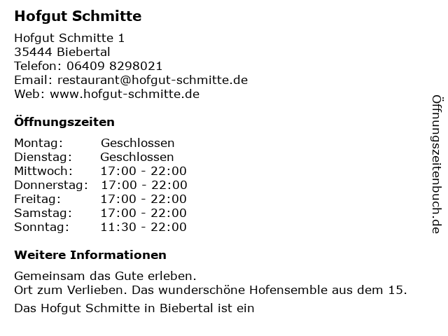 | Öffnungszeiten Hofgut Schmitte in Biebertal anzeigen | |