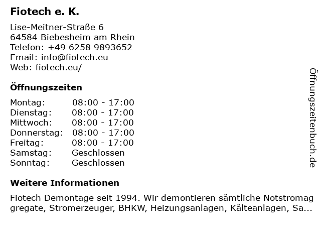 | Öffnungszeiten Fiotech e. K. in Biebesheim am Rhein anzeigen | |