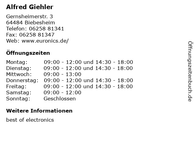 | Öffnungszeiten Alfred Giehler in Biebesheim anzeigen | |