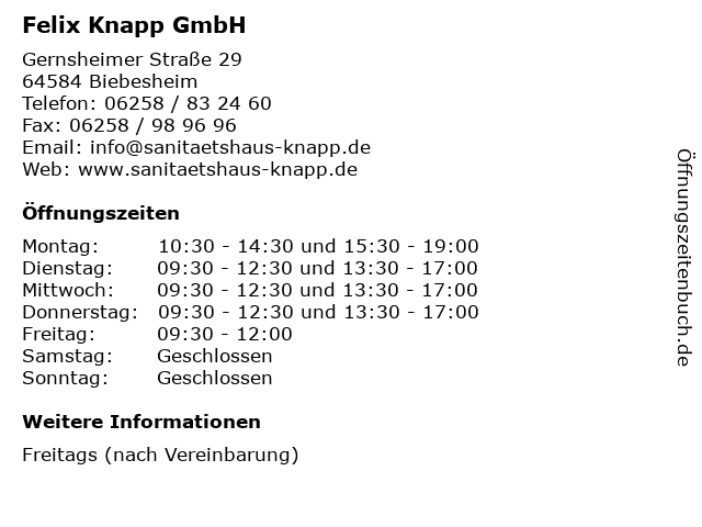 | Öffnungszeiten Felix Knapp GmbH in Biebesheim anzeigen | |
