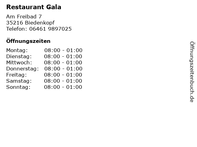 | Öffnungszeiten Restaurant Gala in Biedenkopf anzeigen | |