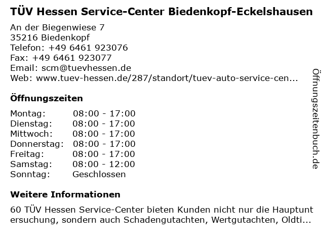 1 TÜV SÜD Service-Center Biedenkopf-Eckelshausen (Entfernung: 0,00 km) An der Biegenwiese 7, 35216 Biedenkopf 3 Evangelische Kirche Wolfgruben - Evangelische-luth. Kirchengemeinde Eckelshausen (Entfernung: 1,29 km) Köppelsweg 4, 35232 Dautphetal 6 |
