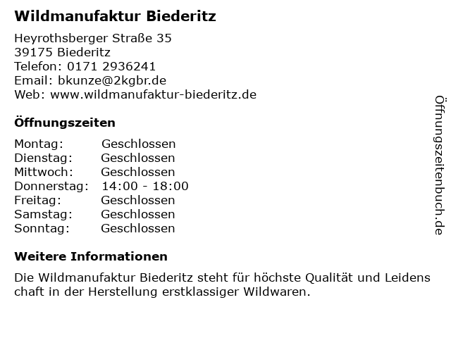 | Öffnungszeiten Wildmanufaktur Biederitz in Biederitz anzeigen | |
