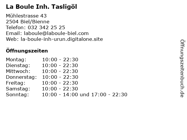 | Öffnungszeiten La Boule Inh. Tasligöl in Biel/Bienne anzeigen | |