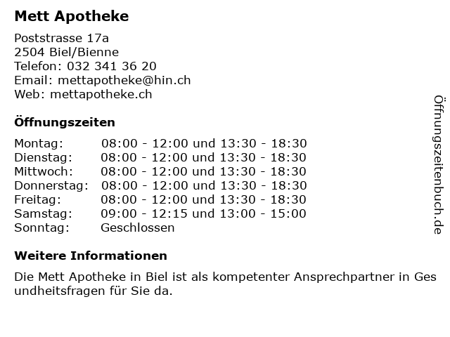 | Öffnungszeiten Mett Apotheke in Biel/Bienne anzeigen | |