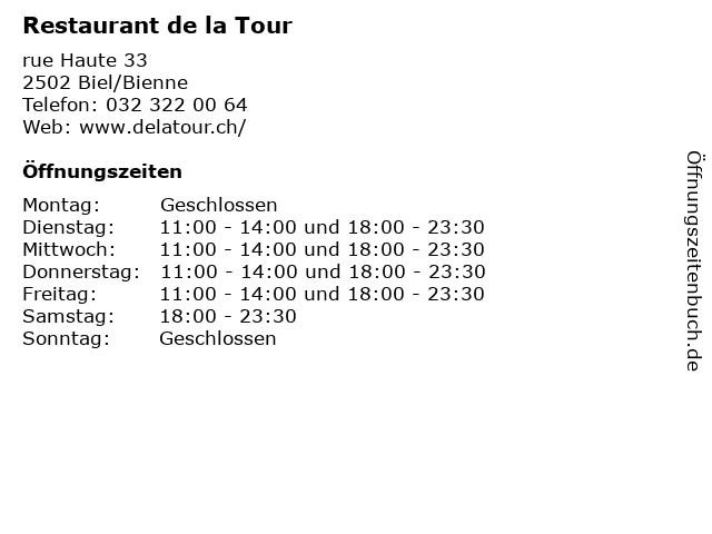 | Öffnungszeiten Restaurant de la Tour in Biel/Bienne anzeigen | |