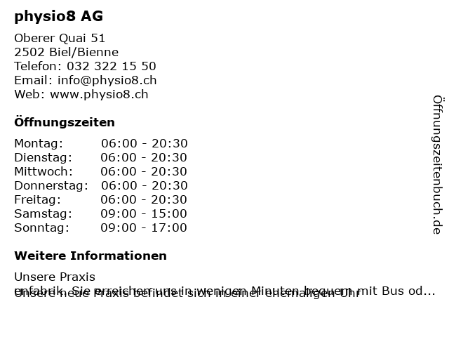 | Öffnungszeiten physio8 AG in Biel/Bienne anzeigen | |
