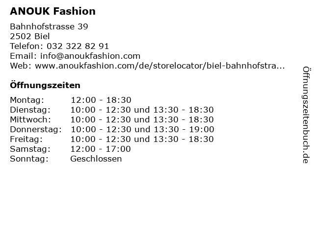 | Öffnungszeiten ANOUK Fashion in Biel anzeigen | |