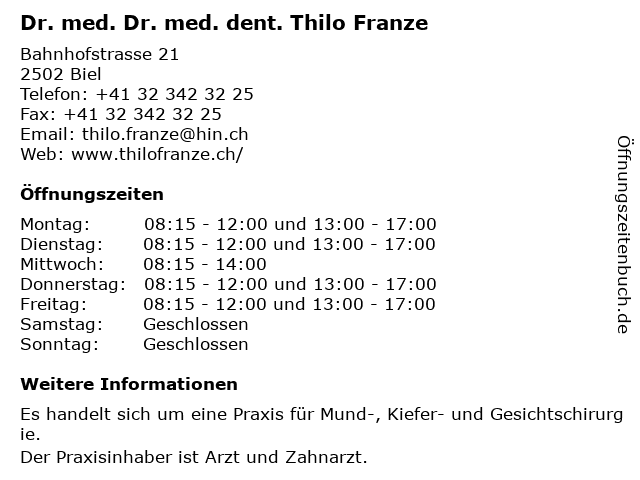1 Zahnarzt Dres. med. dent. Leutenegger / Januth (Entfernung: 0,05 km) Bahnhofstrasse 16, 2502 Biel/Bienne 2 Zahnarztpraxis Biel/Bienne Dr. med. dent. Lisa Leutenegger Dr. med dent. Roman Januth AG (Entfernung: 0,05 km) Bahnhofstrasse 16, 2502 Biel 3 Zahnarztpraxis - Cabinet dentaire in Biel/Bienne Dres. med. dent. Lisa Leutenegger und Roman Januth (Entfernung: 0,05 km) Bahnhofstrasse 16, 2502 Biel/Bienne 5 Dr. med. dent. Manfred Jenni - Fachzahnarzt für Kieferorthopädie SSO (Entfernung: 0,08 km) Bahnhofstrasse 34, 2502 Biel 6 |