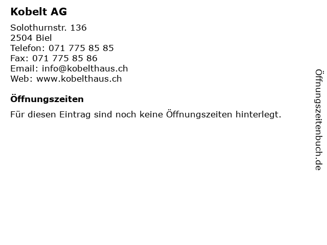 | Öffnungszeiten Kobelt AG in Biel anzeigen | |