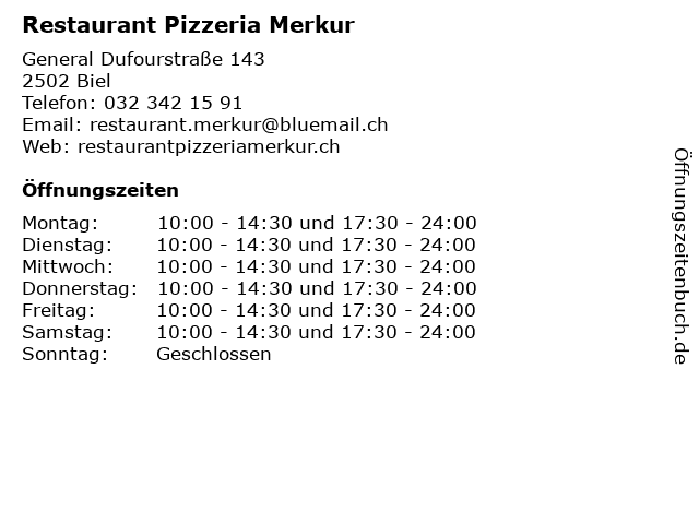 | Öffnungszeiten Restaurant Pizzeria Merkur in Biel anzeigen | |