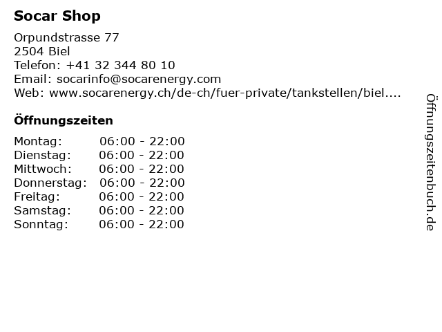 | Öffnungszeiten Socar Shop in Biel anzeigen | |