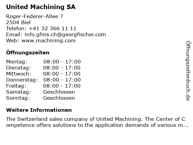 | Öffnungszeiten United Machining SA in Biel anzeigen | |