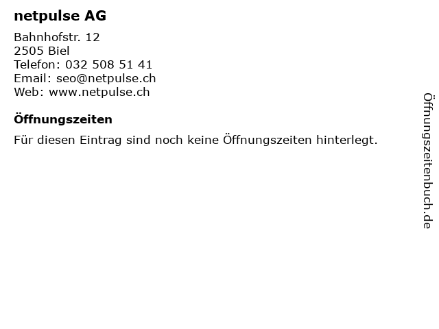 | Öffnungszeiten netpulse AG in Biel anzeigen | |