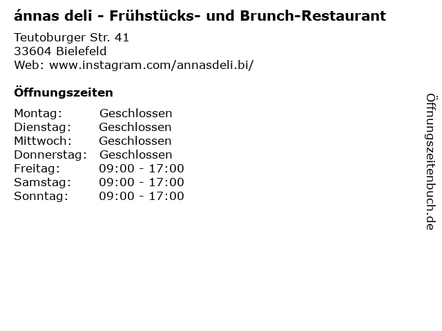 | Öffnungszeiten ánnas deli - Frühstücks- und Brunch-Restaurant in Bielefeld anzeigen | |