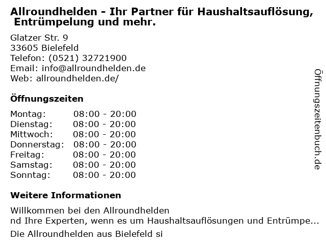 1 ALLROUNDHELDEN - Ihr Partner für Haushaltsauflösung, Entrümpelung und mehr (Entfernung: 0,00 km) Glatzer Straße 9, 33605 Bielefeld 6 |