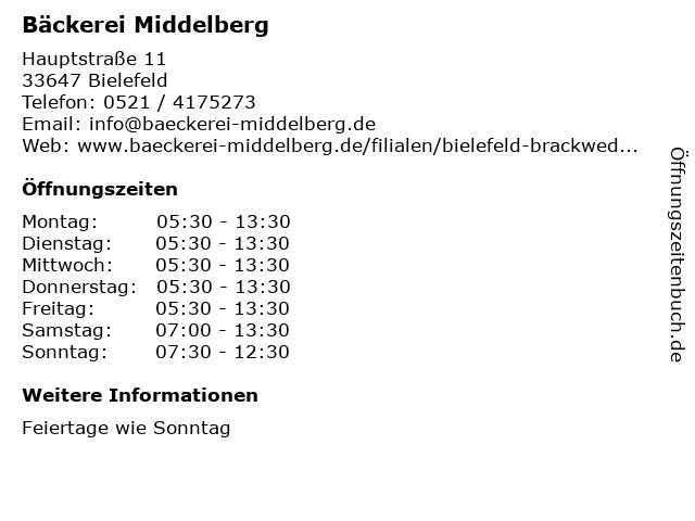 | Öffnungszeiten Bäckerei Middelberg in Bielefeld anzeigen | |