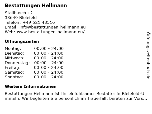 | Öffnungszeiten Bestattungen Hellmann in Bielefeld anzeigen | |