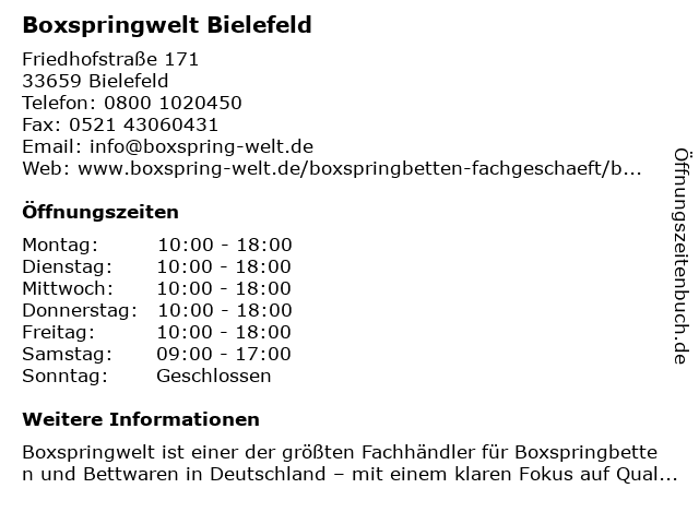 | Öffnungszeiten Boxspringwelt Bielefeld in Bielefeld anzeigen | |