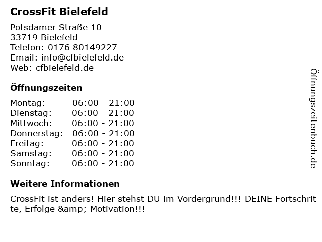 | Öffnungszeiten CrossFit Bielefeld in Bielefeld anzeigen | |