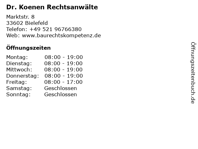 | Öffnungszeiten Dr. Koenen Rechtsanwälte in Bielefeld anzeigen | |