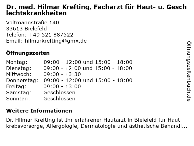 2 Dr. med. Wolfgang Stieler Facharzt für Haut- und Geschlechtskrankheiten (Entfernung: 13,68 km) Ahmser Straße 15, 32052 Herford 5 Haut- u. Haarästhetik Praxis Olga Hellweg Kosmetikpraxis (Entfernung: 18,36 km) Senderstr. 11, 32049 Herford 6 |