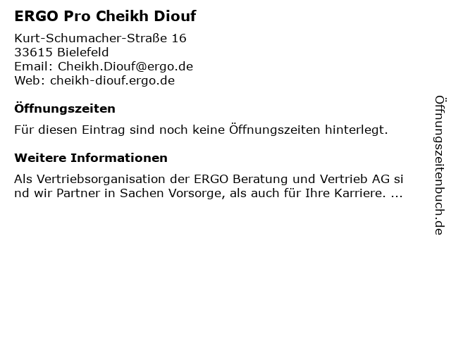 | Öffnungszeiten ERGO Pro Cheikh Diouf in Bielefeld anzeigen | |
