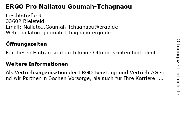 | Öffnungszeiten ERGO Pro Nailatou Goumah-Tchagnaou in Bielefeld anzeigen | |