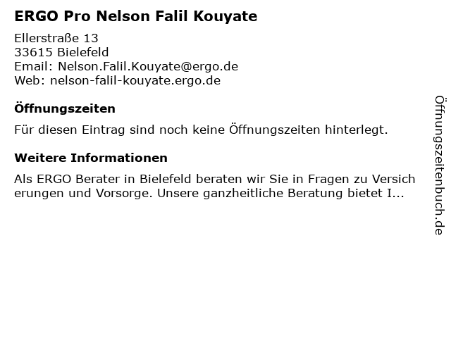 | Öffnungszeiten ERGO Pro Nelson Falil Kouyate in Bielefeld anzeigen | |